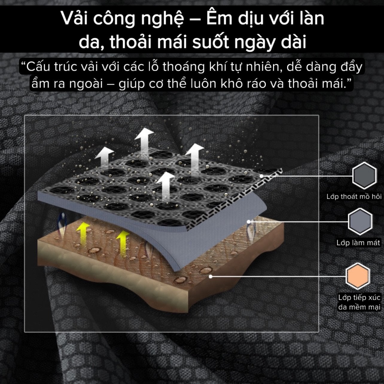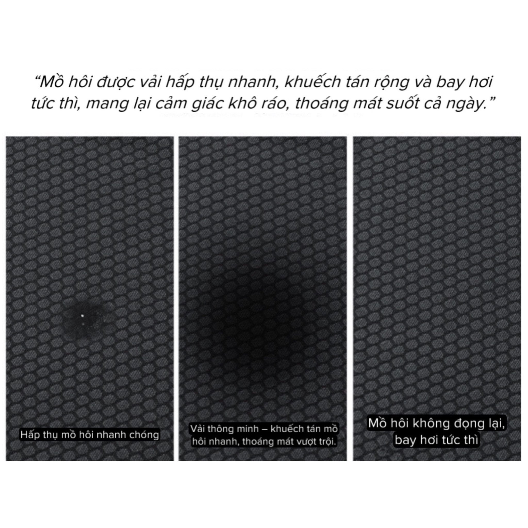 • Thấm hút – Khuếch tán – Bay hơi siêu tốc: mồ hôi được hấp thụ và lan tỏa đều, bốc hơi nhanh giúp chống bết dính.
